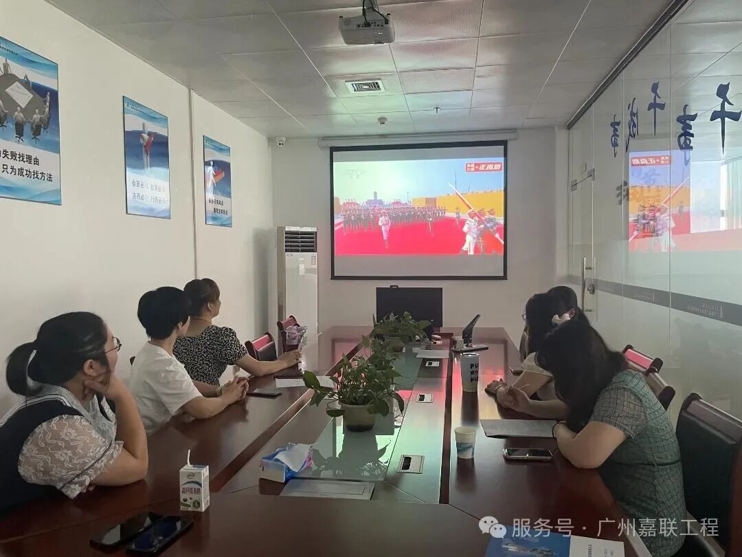 2025年9月3日,中国人民抗日战争暨世界反法西斯战争胜利80周年纪念日,广州嘉联工程技术咨询有限公司总经办组织全体员工集体观看了一场震撼人心的阅兵仪式。整齐的方阵、铿锵的步伐、先进的装备,让嘉联全体员工心潮澎湃,爱国情怀在心中激荡。